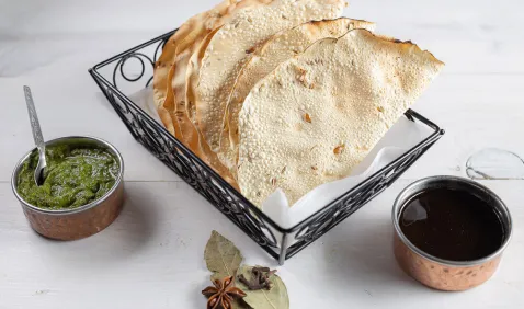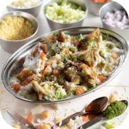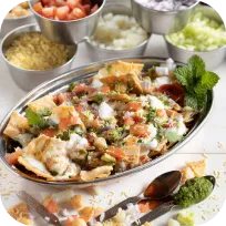 Crisp wafers, potatoes, tomatoes, onions, sweet yogurt topped with chutneys.