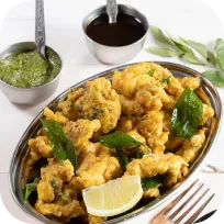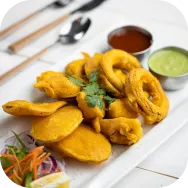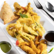 Assortment of chicken pakoras, amritsari fish, vegetable samosa and vegetable pakoras served with dipping sauces.