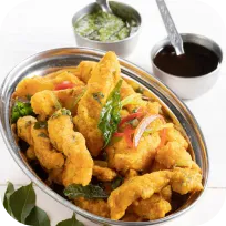 Golden fried chicken tenders dusted with chef’s special masala blend served with cilantro dipping sauce.