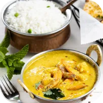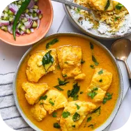 Kerala style fish curry made with coconut milk, turmeric, plum tomato, onion & cilantro, finished with lime.