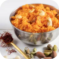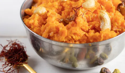 Rich Gajar Halwa with carrots, milk, ghee, and nuts.