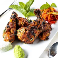 Chicken drumsticks in a classic tandoori marinade of ginger, garlic, yogurt, garam masala and dried fenugreek.
