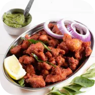 A classic from Chennai, tender bites of spice marinated chicken tempered with mustard seeds and curry leaves, served with mint sauce.