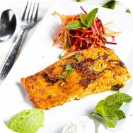 Atlantic salmon marinated in mustard oil, garlic & chili, dusted with spiced chickpea flour & grilled until golden.